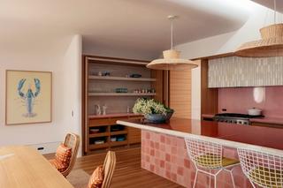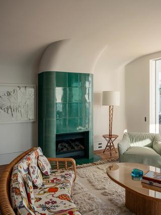 Inside, a sense of movement defines the experience. Light enters through shaped windows, reflecting across gloss ceilings, glazed ceramic tiles and curved forms. Colour and tone deepen as you move through each level, from fresh coastal hues above to oxblood tiles and rich stone floors below. A curated mix of vintage, contemporary and personal pieces further layers the interior with character and warmth.
